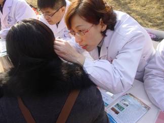 因我院义诊团队到达时间早、位置有利,咨询群众始终络绎不绝。3月3日是“爱耳日”,耳鼻喉科副主任、副主任医师张贤芬积极报名做志愿者,一上午为40多人义务检查、解释病情,其中以耳鸣病人居多。南院急诊科负责人、心内科柳海滨主治医师,被许多患有高血压、冠心病的中老年人围住,咨询病情,柳海滨针对他们的病情,分别给予了治疗建议和健康指导。这次义诊,团委借来电子血压计,检验科志愿者刘亚为130多名群众连续测量了2个半小时的血压,而每一名血压有问题的群众马上就咨询旁边的柳海滨医生。据柳海滨介绍,咨询的三分之二的群众都是血压偏高而又控制得不好,高血压知识、理念存在误区,尤其在用药上不规范,吃吃停停,血压控制效果不理想,其中一位咨询群众的血压多次测量,收缩压都在190mmHg以上,柳医生建议她马上到正规医院详细检查治疗。疼痛科专业较少参加社区义诊活动,这次疼痛科高建东主治医师也非常受欢迎,上午为40多位群众咨询、解答疑问,高医生提醒:年轻人要改变不良生活习惯,尤其是长期一个姿势易疲劳,上午咨询的很多人因长期一个姿势用电脑、玩手机,久之造成了积累性损伤、疼痛。骨科青年医师樊晓光,与高建东医师配合,对患有骨科疾病的群众进行了检查和咨询。