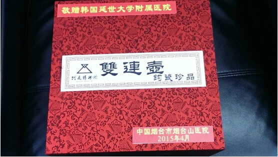 上午会议结束后双方赠送礼品并合影纪念。我院赠送的礼品是6800前出土文物仿真品“双连壶”,寓意和平、友好、相敬、相亲;延世大学回赠Severance医院建院130年纪念品。