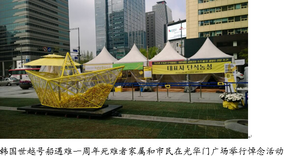4月15日天空蔚蓝、空气清新。我们去医院路经韩国首尔光化门广场,远远看去有不少白色帐篷周边有黄色飘带,近看还有横幅。精通韩国语的李博士告诉我们明天是世越号船遇难周年。我们听后心里也默默为遇难者祈祷。