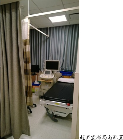 Severance查体中心超声检查分男女不同区域,而且医生与顾客不同通道。超声检查室面积不大但统一配置,无门扇有两层较厚蔓帘保证通风。
