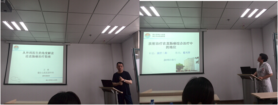 研讨会上,普外科万勇主任从外科角度为大家解读了2015最新版美国NCCN结直肠癌治疗指南。放疗二科葛兴萍主任则为大家系统介绍了放射治疗在直肠癌综合治疗中的地位。此外,普外科万主任和放疗二科赵树樑医师还分别分享了1例胃癌综合诊疗的体会和经验。参与研讨会的张耀、王晓东主治医师等还针对肿瘤综合治疗过程中经常遇到的问题进行了讨论,张恩宁副院长、万勇主任、周冬梅主任和葛兴萍主任则分别进行了解答和探讨。