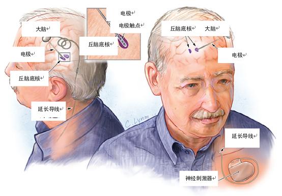 神经内科孔敏博士介绍,脑深部高频电刺激(DBS)即“脑起搏器”,已经发展成为传统的立体定向功能神经外科中常用的毁损手术的替代方法。DBS已经证实是一种有效的方法,由于它具有可逆性和可调性的特点,大大降低了手术的致残率。这种手术方法最开始应用于治疗运动障碍病,常选用的几个靶点位置为丘脑、苍白球和丘脑底核。脑起搏器的组成以及临床植入方式如图所示:脑起搏器包括脉冲发生器、延长导线和电极三个部件,电极植入脑内,对于帕金森病来说,通常是丘脑底核,脉冲发生器植于胸前皮下,延长导线在皮下连接脉冲发生器和电极。脑起搏器产生的高频电刺激脉冲,通过电极触点作用于脑内靶点核团,抑制因多巴胺能神经元减少而过度兴奋的神经元的电冲动,减低其过度兴奋的状态,从而有效治疗帕金森病的震颤、僵直和运动迟缓等症状。