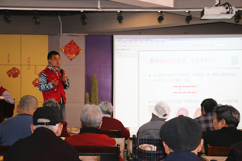 九时,福利院老人们纷纷来到多功能会议大厅,大家扶老人入座、为他们清洗分发水果……瞬间忙作一团,很快大厅里座无虚席。我们男丁格尔第一项活动—《慢性病防治健康教育大讲堂》开始了。台上讲得形象生动、台下老人们聚精会神,在互动环节,老人们争先恐后参与提问,授课者都一一给予了耐心答复。经过前期的精心准备,结合老年人特点进行了《认识糖尿病》、《糖尿病防治科普》、《高血压防治》三项健康教育讲座。整场讲座收到了良好效果。最后,老人们以全场热烈的掌声表达了他们深深的谢意。