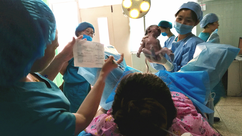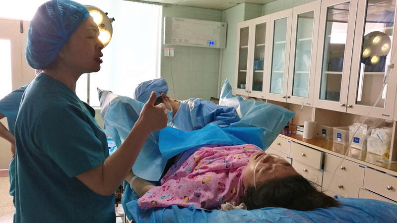 中午11点,王女士被送进了分娩室。谭彩宏护士长说:“每个人在分娩的时候都会紧张,因为她要面对陌生的环境、陌生的人,她会去想分娩的过程是否顺利,生出来的宝宝是否健康。王女士同样也会紧张,但她没法通过语言与我们交流,这一点儿正是我们所担心的。”考虑到王女士的特殊情况,产房允许她的婆婆进到产房陪产。“我们也找好了纸和笔,随时和她沟通交流,助产士郝春妮一直陪在她的身边,助产士李晓燕也在为她忙前忙后。”