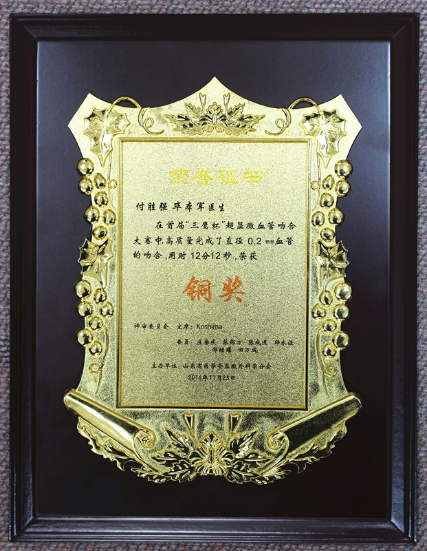 近日,我院手外科付胜强、毕本军两位医生代表烟台山医院,参加由中华医学会山东省显微外科专业委员会主办的首届“三鹰杯”超显微血管吻合大赛,用时12分12秒,高质量地完成了直径0.2mm血管的吻合,在比赛中荣获铜奖。