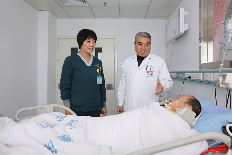 (胸外科刘曙亮主任与ICU张蔚副主任为患者检查病情)