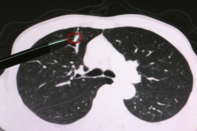 拍完片,做完CT检查以后,接诊的烟台山医院心胸外科主任医师杨军发现:患者右肺上叶有一个长约1.5厘米的异物,胸腔内出现了积血、积气。杨军主任医师结合患者的工作情况断定患者系被锻压产生的金属碎片击伤。