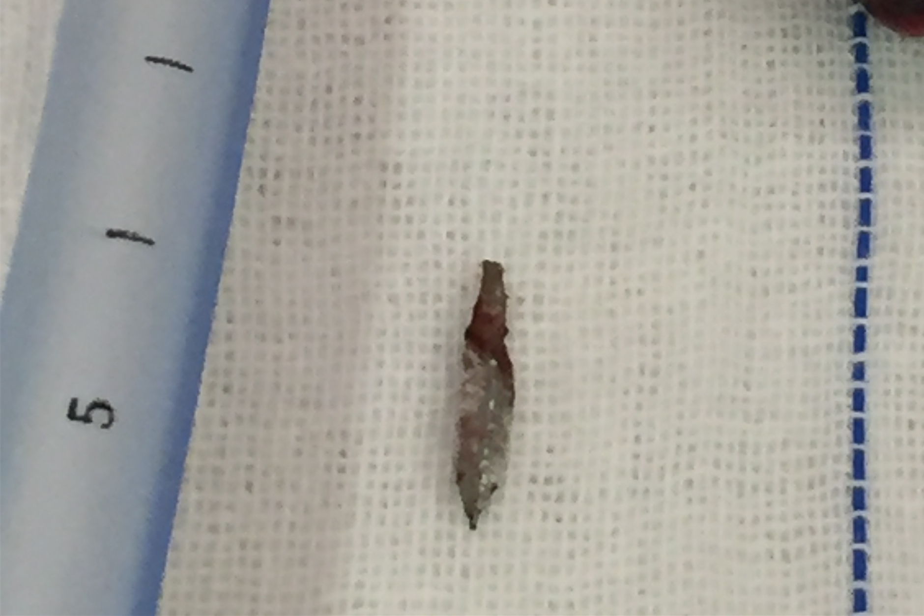 凶险随时可至,病情就是命令!姜文升副主任医师迅速组织科室人员,联合手术室、麻醉科准备这台急诊手术,并紧急拟定了手术方案:如果异物没有移位,就在胸腔镜下开展微创手术,将异物取出;如果异物移位,就需要在术中借助X线指引进行手术,并做好了开胸手术的准备。姜文升副主任医师表示:“我们在患者胸壁上切开小口,进入胸腔镜进行探查,我们发现患者体内的异物并没有移位。对于患者而言,这算是不幸中的万幸。”此后,姜文升副主任医师经小切口进入切割缝合器,切除患者裂伤的肺组织并将金属异物一并全整取出,整个过程不到10分钟,“取出的异物长约1.5厘米,宽约0.5厘米,而且较为锋利。”1小时过后,患者安全返回病房,目前正在康复中。