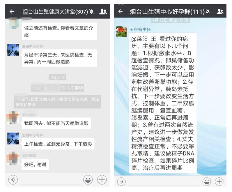 “两群”指的是“烟台山生殖健康大讲堂”和“烟台山生殖中心好孕群”。生殖医学中心所有的医、技、护人员均在群内,可为患者提供生殖临床、生殖男科、生殖实验室、生殖护理和生殖中医等有关知识。建群的初衷是因为我们深知在备孕过程中,多数患者会有心理压力,如果再有疑问,上网查询又得不到结果,会更加影响备孕的心情,不利于怀孕。我们通过微信群很及时的解决患者朋友的疑难问题,减轻心理压力。建微信群的目的提供生殖健康知识,让患者在孕育之路上少走弯路,尽快让大家享受天伦之乐。在备孕过程中有什么疑问,不用去百度搜素,直接打开微信发出问题,生殖医学中心中心医生会及时回复,争取做到“即问,即答,解忧愁”。“ 烟台山生殖健康大讲堂”是为初诊的患者准备的一个微信群,截止到目前,已经有302人入群,每天问题回答的信息量数百条,解决患者朋友在孕育过程遇到的问题。诸如:不知道怎样服药,不知道自己详细病情,不知道做检查的流程等纠结的问题,在微信群中都能及时解决,有效缓解患者备孕过程中的压力,使大家安心舒心、顺心孕育。“烟台山生殖中心好孕群” 是为人工授精和体外受精-胚胎移植(试管婴儿)准备的,为了保护患者们的隐私,我们经过严格的审查才能进入本群。截止到目前,已经有111人入群。在辅助生殖助孕过程中流程相对较复杂,患者朋友的压力也会越大,对助孕的方式、助孕的费用,助孕的成功率、助孕的安全性及助孕过程中遇到种种问题,都可以通过本群的及时交流,使大家“疑有所问,难有所解”,轻松愉快的度过整个助孕过程。