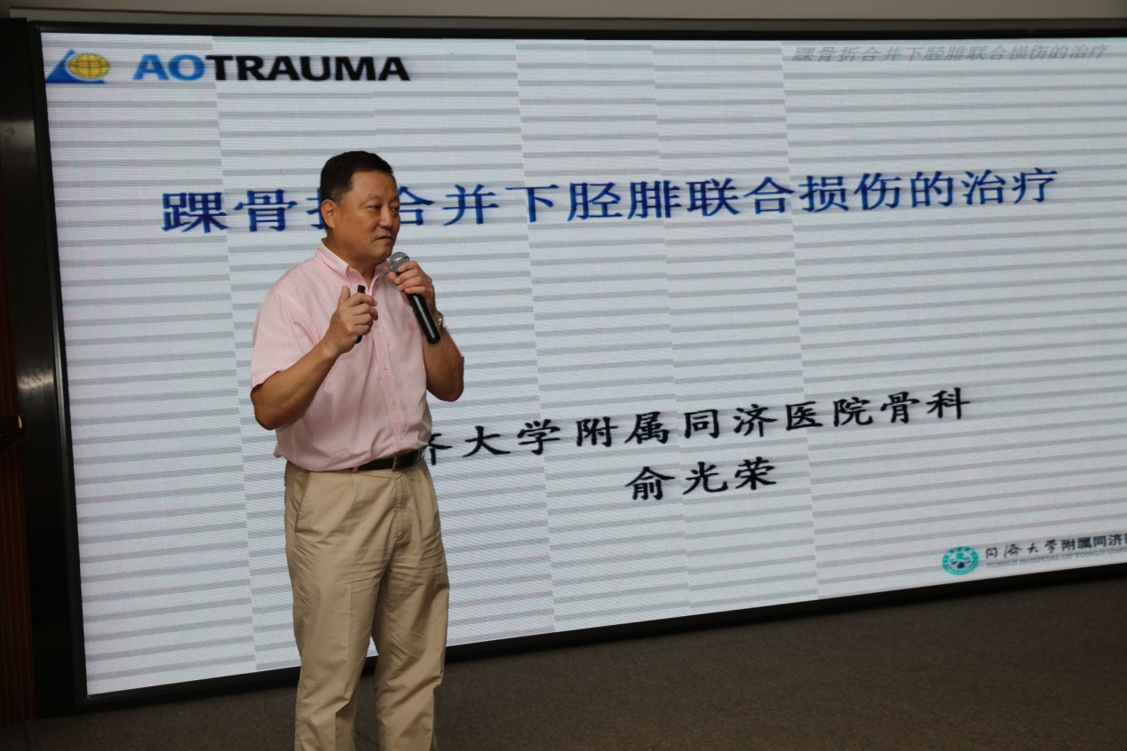 早8点到9点,俞光荣教授带领我院足踝外科团队开展查房,为2名足踝创伤后遗症需要矫形的患者进行了详细检查;上午9点到12点,俞教授进行了题为“踝骨折合并下胫腓联合损伤的治疗”和“踝关节骨折治疗陷阱”的精彩授课,授课内容多为业内最新进展,令参会医师大开眼界;下午13点到16点,俞光荣教授在我院手术室开展了一例复杂足踝部创伤后遗症手术治疗,参会医师通过我院的高清转播系统观摩了整个手术过程,明确了矫形手术在重建方面与单纯创伤性疾病的区别,进一步加深了对矫形性疾病的认识。