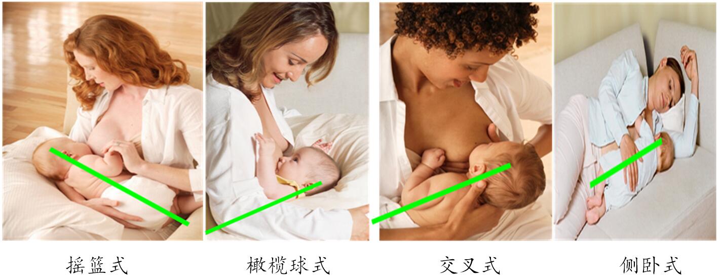 正确的哺乳姿势: 孩子的头、背、臀在一条直线上,与妈妈胸贴胸,腹贴腹。