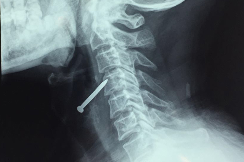 我院耳鼻喉科近日接诊了一位铁钉误伤颈部的患者,并为其及时手术,得以化险为夷。