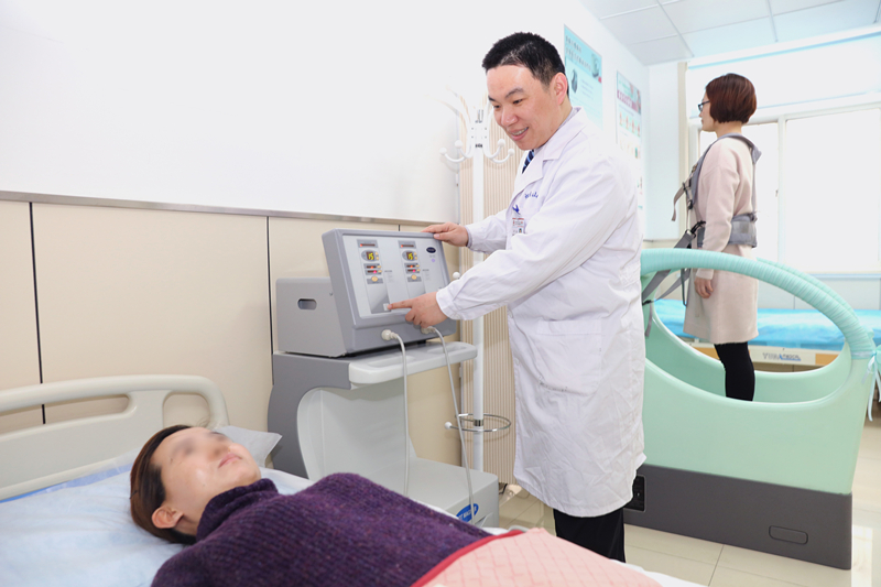 烟台山医院骨病与慢病科医生正在为患者做物理治疗