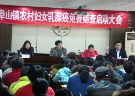 3月17日上午,招远市农村妇女乳腺癌免费筛查工作启动仪式在阜山镇政府四楼会议室召开。市卫生和计划生育局副局长王玉胜、市妇联副主席马文玲、市妇幼保健院院长谢春丽、阜山镇党委副书记蒋金铎以及阜山镇各村妇女主任50余名参加会议。会议就我市阜山镇9000多名35-64周岁农村妇女乳腺癌免费筛查工作做了安排与部署。